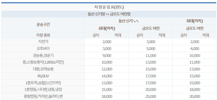 금오도 배운항요금과 차량선적요금을 확인해 보시기 바랍니다. 자세한 사항은 한림해운여수에서 바로 확인이 가능합니다.