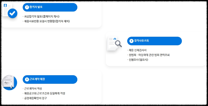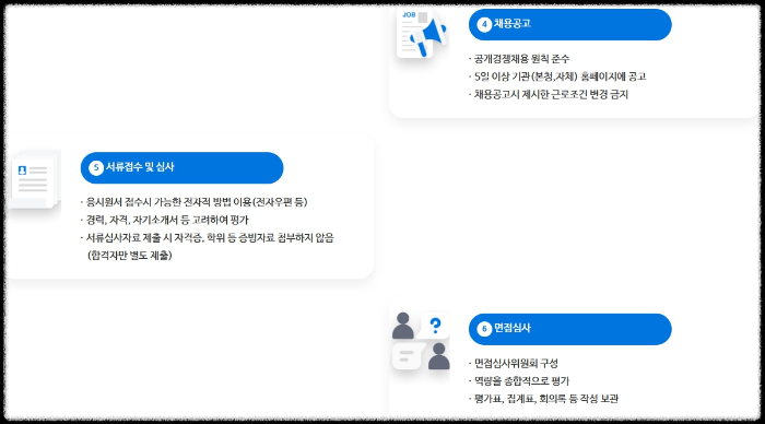 채용공고 >>> 선발전형 1차 >>> 선발전형 2차 >>> 임용예정자 추천 >>> 채용 대상자 결정 및 통지 >>> 절격사유 조회 >>> 계약 및 임용